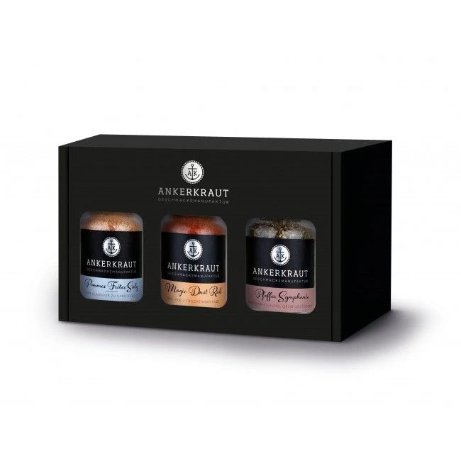 Die 3 beliebtesten Gewürzmischungen von Ankerkraut erhalten Sie hier in einem dekorativen Geschenkset. Die ausgewählten Mischungen versprechen durch die Verwendung hochwertiger Zutaten den puren Geschmack. Ohne Geschmacksverstärker oder andere Zusätze.