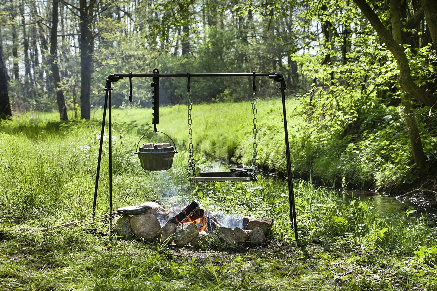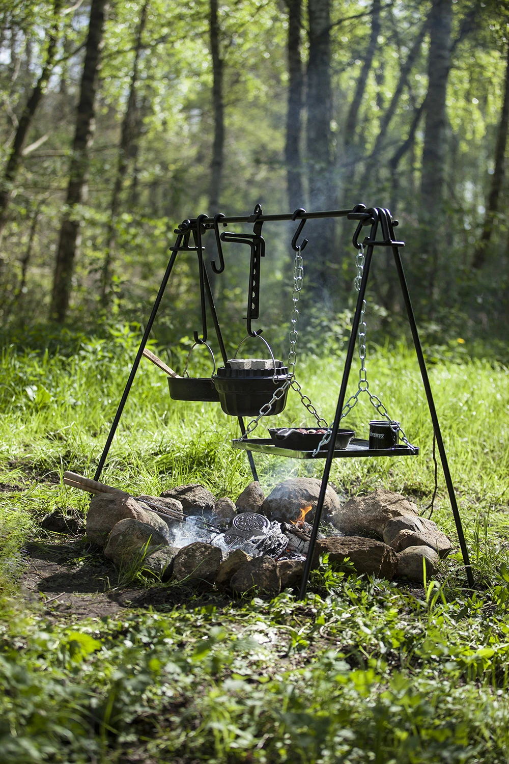 Das stabile Gestell aus pulverbeschichtetem Stahl lässt sich einfach montieren. An den drei Haken unterschiedlicher Länge können Sie Dutch Oven und andere Töpfe und Kessel direkt über der Feuerstelle sicher aufhängen und so die verschiedensten Köstlichkeiten über offenem Feuer zubereiten.