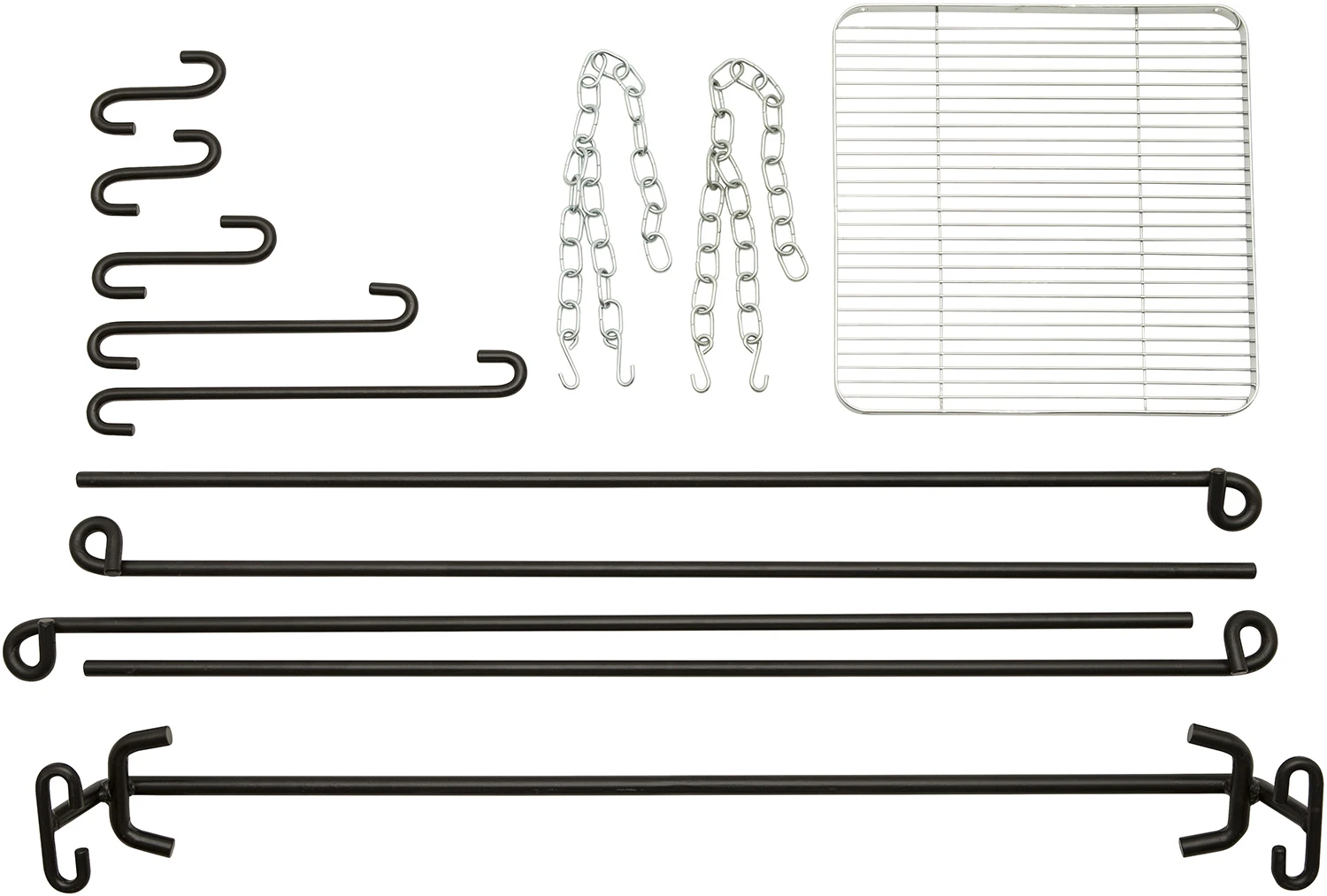 Ebenfalls im Lieferumfang enthalten ist ein 39 x 39 cm großer Grillrost aus verchromten Stahl. Dieser wird an zwei individuelle höhenverstellbaren Ketten befestigt. Ein umlaufender, erhöhter Rand sorgt dafür, dass das Grillgut nicht herunterrutschen kann.