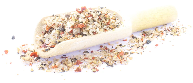 | Inhaltsstoffe / Zutaten | 60 % Salzflocken (Pyramidensalz), Gewürze (15% Tellicherry Pfeffer, grüner Pfeffer, Chili), geräuchertes Salz (Speisesalz, Rauch), Knoblauchgranulat, Zwiebelgranulat |